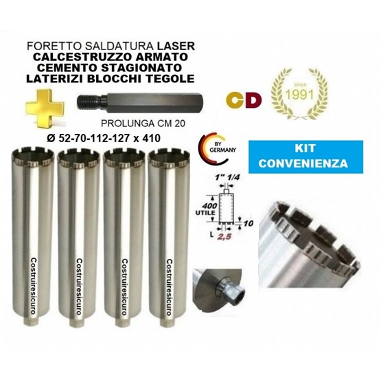 Corona Diamantata A Umido D. 52-70-112-172 X 410 Kit Foretti Per Carotatrice 1/14