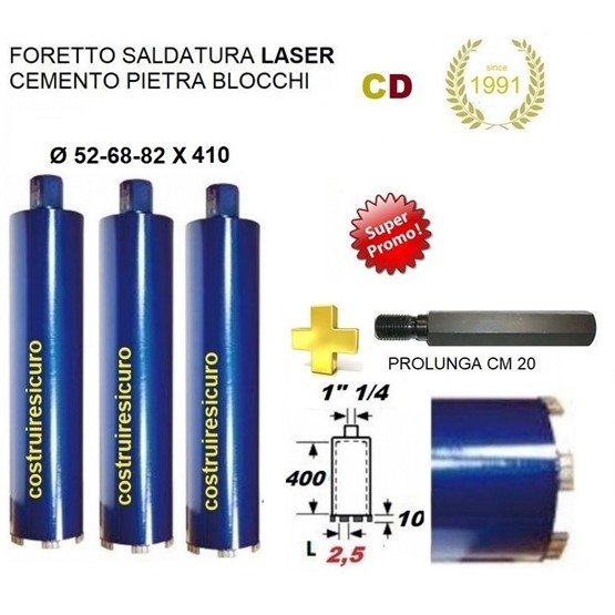 CARATTERISTICHE: corona diamantata a secco  con saldatura laser e attacco 1 1/4" lunghezza 400 mm.utile  foretti diamantati  per carotatrici a telaio portatili per forature ad alta velocità