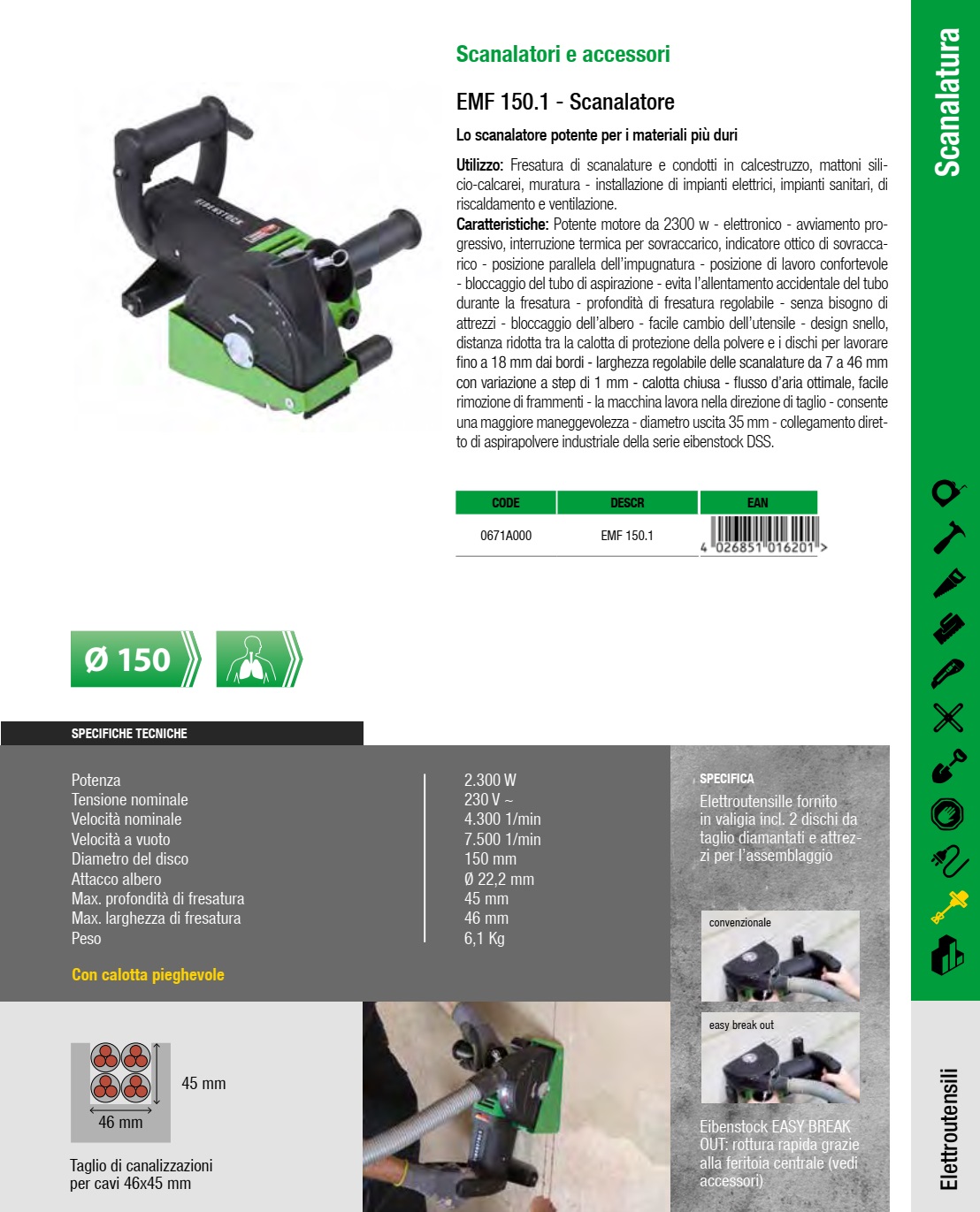 Scanalatrice Per Calcestruzzo Mattoni Emf 150.1 Da 2300w Ideale Per Tutti I Materiali Duri Utilizzabile Anche Con 3 Dischi