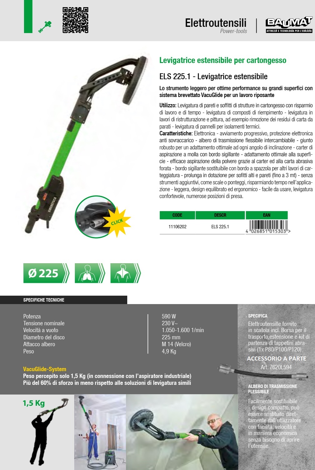 – Elettronica – avviamento progressivo, protezione elettronica anti sovraccarico – Albero di trasmissione flessibile intercambiabile – Giunto robusto per un adattamento ottimale ad ogni angolo di inclinazione – Carter di aspirazione a molla con bordo sigillante – adattamento ottimale alla superficie- Efficace aspirazione della polvere grazie al carter ed alla carta abrasiva forata – Bordo sigillante sostituibile con bordo a spazzola per altri lavori di carteggiatura – Prolunga in dotazione per soffitti alti e pareti (fino a 3 mt) – senza strumenti aggiuntivi, come scale o ponteggi, risparmiando tempo nell’applicazione – Leggera, design equilibrato ed ergonomico – facile da usare, levigatura confortevole, numerose posizioni di presa