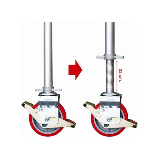 - Con gambe livellatrici a vite montate su ruota che permettono una regolazione millimetrica fino a 35 cm.