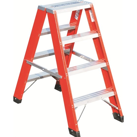 Caratteristiche: Sgabello pieghevole a doppia salita Montanti in vetroresina mm. 95 per isolamento elettrico Gradino in alluminio profondo mm. 90 con superficie anti-scivolo Ripiano in alluminio mm. 200 x 300 Barre distanziatrici automatiche di sicurezza in alluminio Inclinazione salita 68° Rinforzi alle estremità inferiori per irrigidimento base Piedini in materiale sintetico anti-scivolo