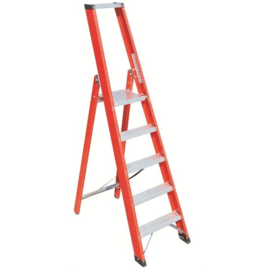 Caratteristiche: Scala in vetroresina ad una salita con parapetto di sicurezza frigerio V026/6 Rampa di salita e cavalletto con montanti in vetroresina per isolamento elettrico Larghezza gradino mm. 90 Gradini in alluminio con superficie anti-sdrucciolo 1 Montante in vetroresina mm. 95 Piattaforma in alluminio mm. 290 x 260 Parapetto di sicurezza regolamentare cm. 70 Vaschetta porta - oggetti in alluminio Piedini con superfice anti-scivolo Cintino anti-divaricamento in materiale sintetico Rinforzi alle estremità inferiori per irrigidire maggiormente la scala