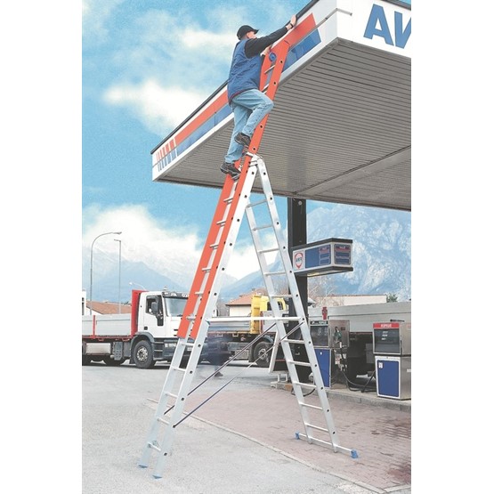 caratteristiche: scala mista in alluminio e vetroresina a 3 rampe 3047V Frigerio con tronco superiore con montanti in vetroresina per isolamento elettrico.Tronchi di base in alluminio per mantenere la scala leggera e robusta . Piolo quadrato mm. 30 x 30 in alluminio con superficie anti-scivolo . Attacco piolo - montante con doppia bordatura. Allungabile con meccanismo a sfilo manuale. Arresto tronchi a sfilo mediante ganci automatici con sicura anti-sganciamento. Tronco superiore dotato di rotelle di scorrimento a muro. Tronco superiore sfilabile e utilizzabile come scala in appoggio. Barre distanziatrici di sicurezza anti-chiusura in alluminio. Cintino di sicurezza anti-divaricamento. Basetta stabilizzatrice in alluminio. Tappi alle estremità con superficie anti-scivolo