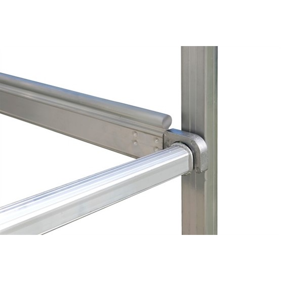- Parapetto ad aggancio rapido con profilo rinforzato testato per una spinta laterale di 150 kg.