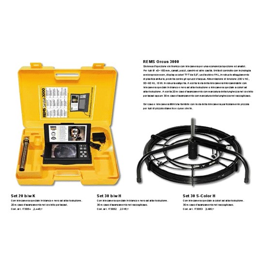 Caratteristiche: Videocamera d'ispezione mod ORCUS REMS con  sistema d'ispezione elettronico con camera leggero e maneggevole per una economica ispezione ed analisi di danni a tubazioni, canali, camini ed altre cavità. Anche per l'ispezione dopo i lavori di pulizia dei tubi e per il collaudo di nuove installazioni o di riparazioni. Per azionamento a corrente elettrica, a batteria o ad alimentazione per auto.