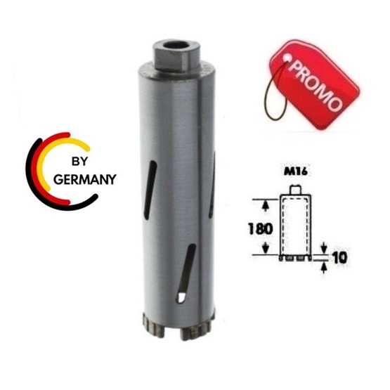 Caratteristiche: Foretto diamantato professionale a secco per carotatrici con saldatura laser Lunghezza corona 180mm. attacco M16 applicazioni cemento leggermente armato, e laterizi. Segmenti scanalati per lo scarico dei materiali