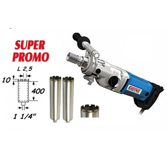 Caratteristiche: Carotatrice CX 18C2 COMER con kit corone diamantate potente per uso universale. Lo strumento perfetto per forare a secco o ad umido su cemento e asfalto. Questo motore a 2 velocità è utile per praticare in modo rapido e preciso fori in cemento armato, muratura in mattoni o pietra naturale. motore 1800W tensione 230 V giri al minuto: prima velocità seconda velocità 1000 g/1’ 2600 g/1’ attacco corona 1’1/4-M16-1/2'' GAS diametro massimo di perforazione 120 mm su cemento 180 mm su mattone perforazione a secco/acqua peso 6.5,