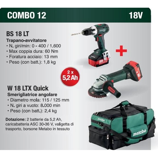Trapano A Batteria Metabo Bs 18 Lt E Smerigliatrice 18v 5,2 Ah + Borsone
