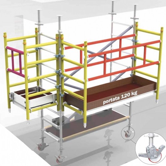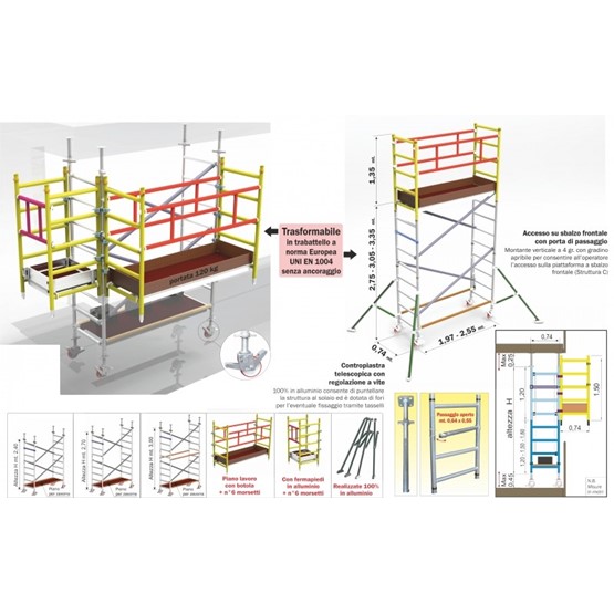 Ideato per interventi di manutenzione e ripristino balconi in abitazioni condominiali, consente di operare ad ogni piano del condominio senza dover installare un ponteggio con appoggio a terra. Le 8 gambe telescopiche con regolazione a vite aiutano a stabilizzare con precisione il modulo portante e morsetti in alluminio sostengono e regolano l’altezza dello sbalzo frontale e laterale. Trasformabile in trabattello, secondo UNI EN 1004, ad uso 2 non ancorato con portata di 200 kg/m per ogni piano lav.