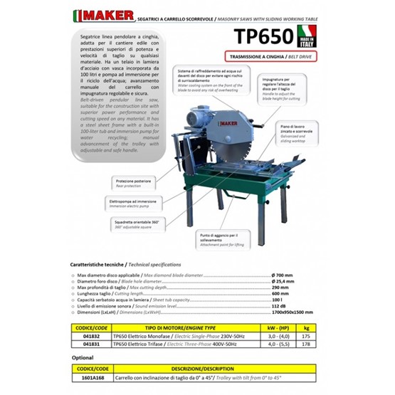 Le taglierine Maker di questa serie sono ideali per chi vuole una macchina facilmente manovrabile e quando si richiedono prestazioni superiori di potenza e velocità di taglio. La serie TP SPECIALcon trasmissione a cinghia viene fornita in versione monofase con avviamento del motore con innesto centrifugo per facilitare la partenza. La colonna sulla testa motore è regolabile in altezza, per raddoppiare l'altezza max. di taglio girando semplicemente il pezzo da lavorare sul carrello. Avanzamento manuale del carrello che scorre su cuscinetti stagni. Inclinando la testa motore si possono effettuare tagli a qualsiasi angolazione fino a 45° per tutta la lunghezza del taglio utile. Vasca e carrello sono completamente zincati per aumentare la resistenza alla corrosione. Pompa dell'acqua per il raffreddamento del disco con doppio sistema di flitraggio posta all'interno della vasca. Squadretta regolabile di 360°, gambe smontabili per limitare gli ingombri nei trasporti. Interruttore magneto- termico con bobina.
