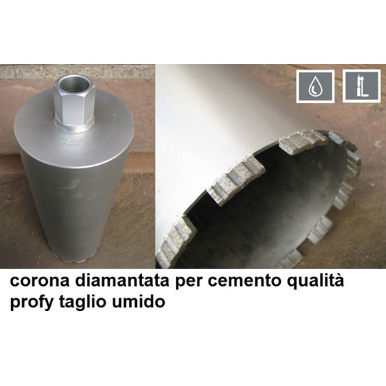 - Corona diamantata C.D. ALTA QUALITA' ad umido per carotatrici a telaio Ideale per applicazioni su calcestruzzo da medio a duro. Ideale per motori a partire da 1 kW lunghezza punta 410mm attacco 1 1/4" con saldatura laser