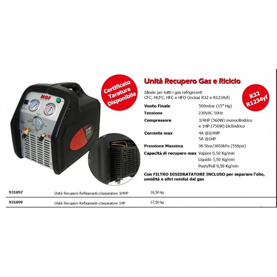 | 931097 | Unità recupero gas refrigerante con separatore 3/4HP | 16,50 Kg |