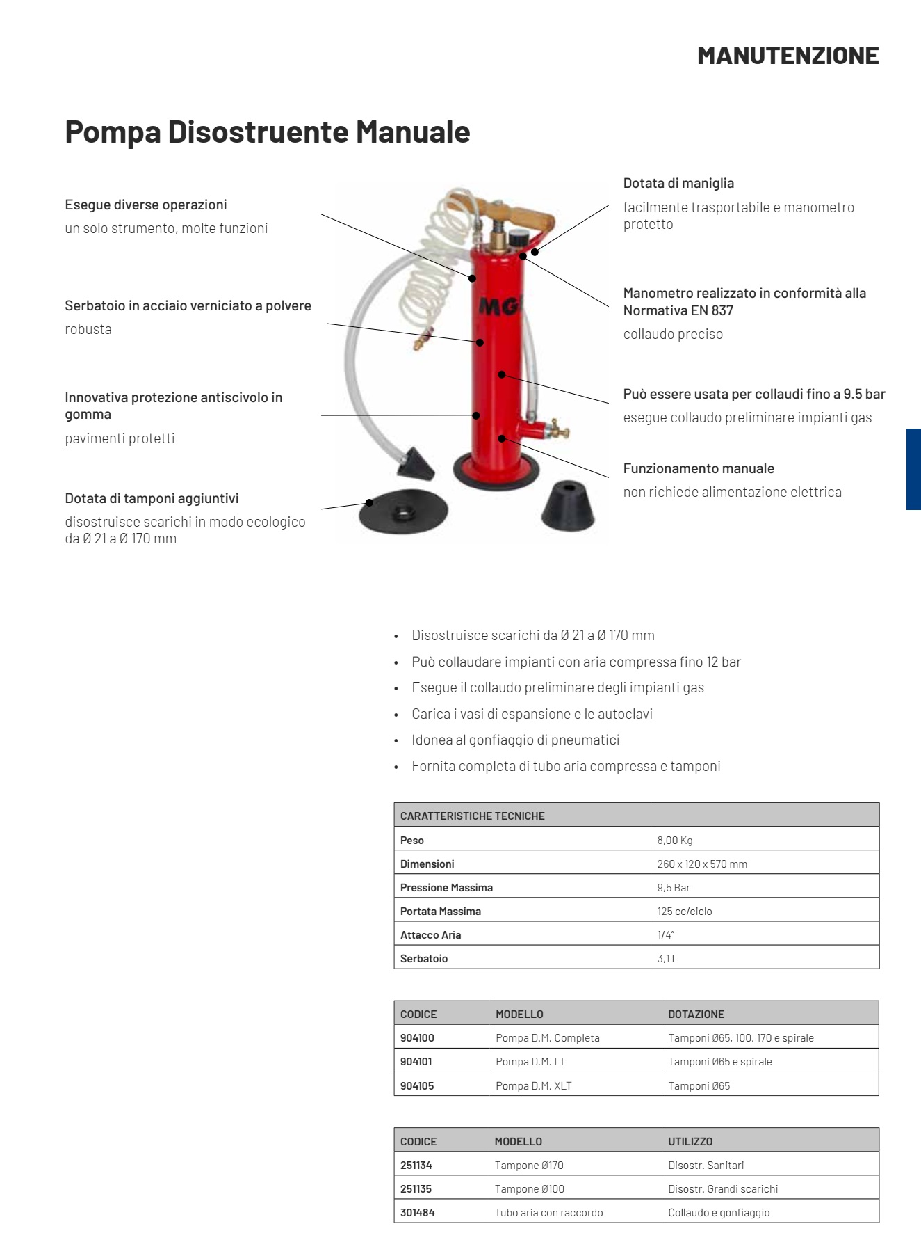 pompa disostruente manuale mgf sturalavandini cod 904100 Sistema semplice e multifunzione per disostruire, gonfiare, collaudare...